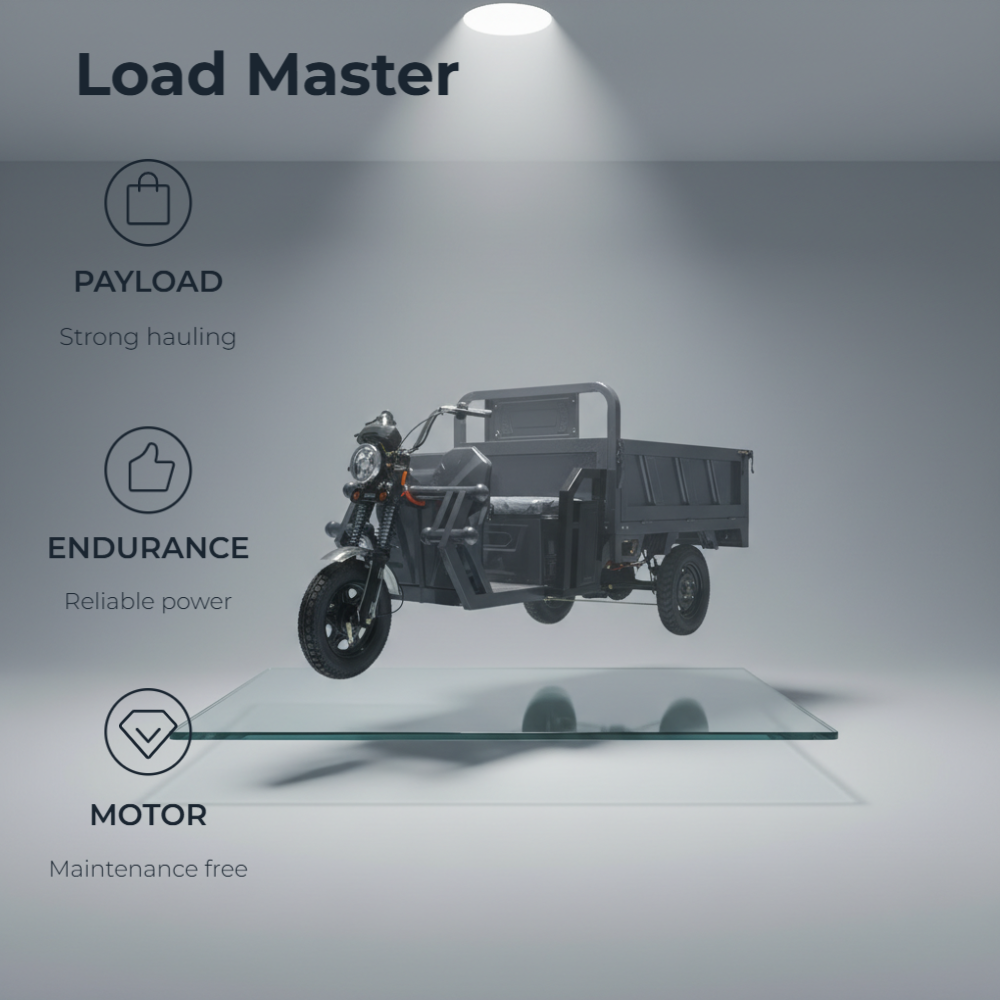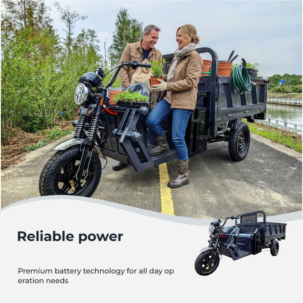 Brushless motor and high-capacity lithium battery powering our carbon steel electric cargo tricycle, delivering consistent performance for industrial transport. Heavy-duty tires and advanced shock absorption system ensure a smooth, stable ride on rough industrial roads, even with maximum load capacity. Ergonomic seating and spacious driving area on our carbon steel electric cargo tricycle, providing comfort and support for long hours of industrial operation. Our carbon steel electric cargo tricycle is versatile and reliable, perfect for industrial transport, construction sites, and heavy logistics operations.Advanced safety features, including reliable brakes, bright LED lights, and a protective front guard, ensure safe operation even in demanding industrial environments. Fast-charging capability on our carbon steel electric cargo tricycle ensures minimal downtime, supporting all-day industrial transport and heavy logistics operations. Customizable carbon steel electric cargo tricycle available in multiple colors and with logo printing options, tailored to meet industrial branding needs. Customizable Carbon Steel Electric Cargo Tricycle for Industrial Branding