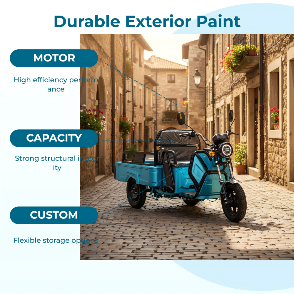 Our Compact Electric Cargo Tricycle is the perfect family utility vehicle, combining an 800-1200W motor, compact design, and flexible cargo space. Designed to simplify daily family tasks, it is the ideal zero-emission solution for neighborhood transport, grocery shopping, gardening, and casual family outings.